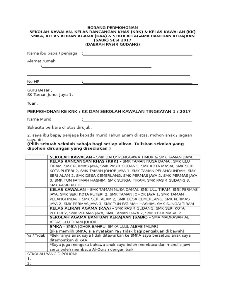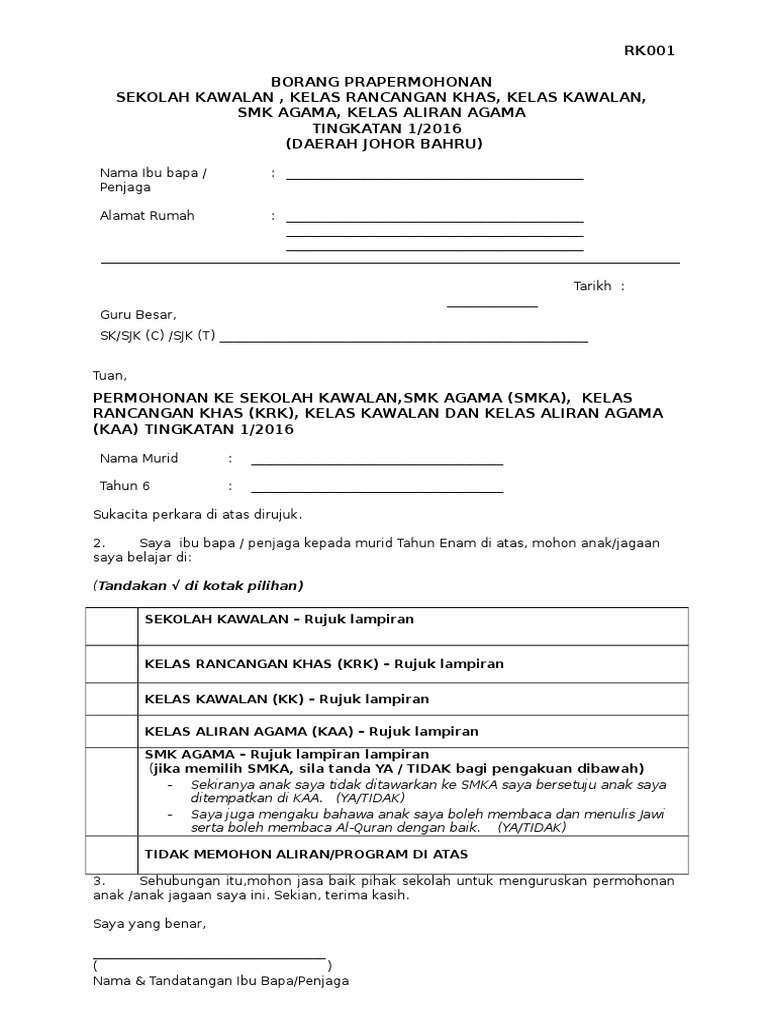 Borang Permohonan Sekolah Kawalan Pdf